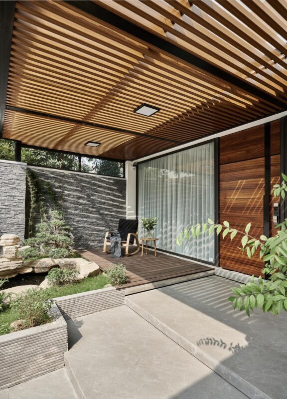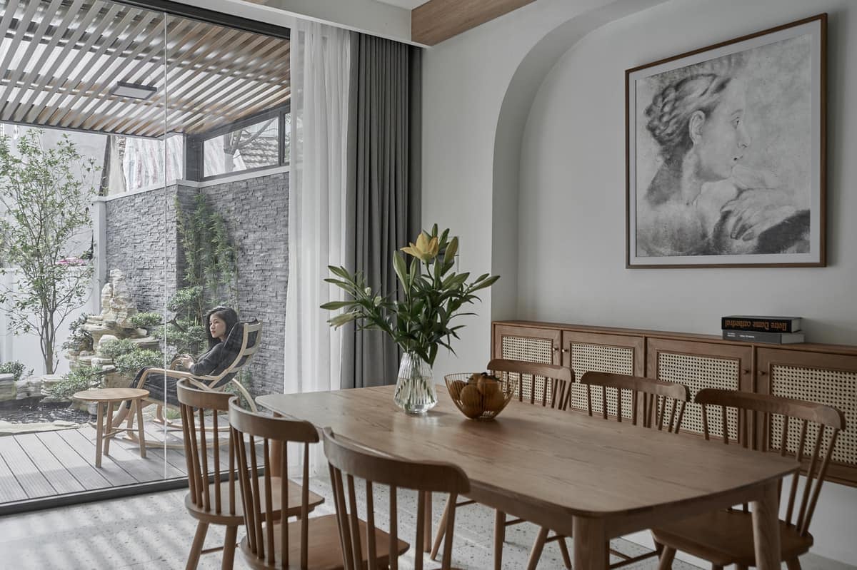 Bước vào bên trong, chúng ta sẽ bắt gặp ngay khoảng rộng với cây xanh xung quanh. Nơi đây thích hợp để các thành viên trong gia đình ngồi quây quần trò chuyện và thư giãn sau ngày mệt mỏi.